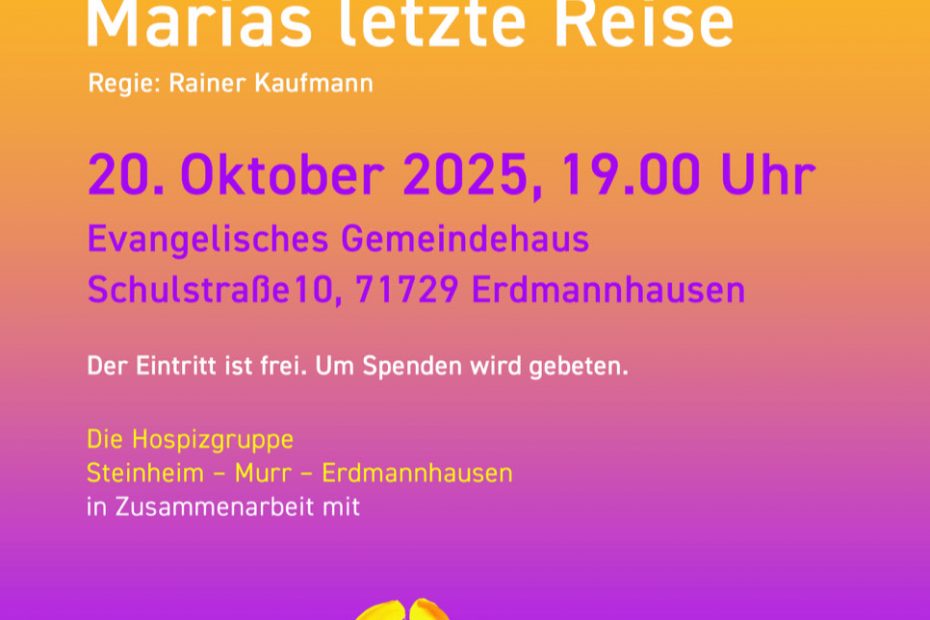 20. Oktober | 19:00 Uhr | Erdmannhausen | Hospizgruppe Steinheim – Murr- Erdmannhausen Filmabend „Marias letzte Reise“ Marias letzte Reise ist ein im Jahr 2005 erschienener deutscher Film, der die letzten Tage einer krebskranken Bäuerin zeigt.… Filmabend „Marias letzte Reise“