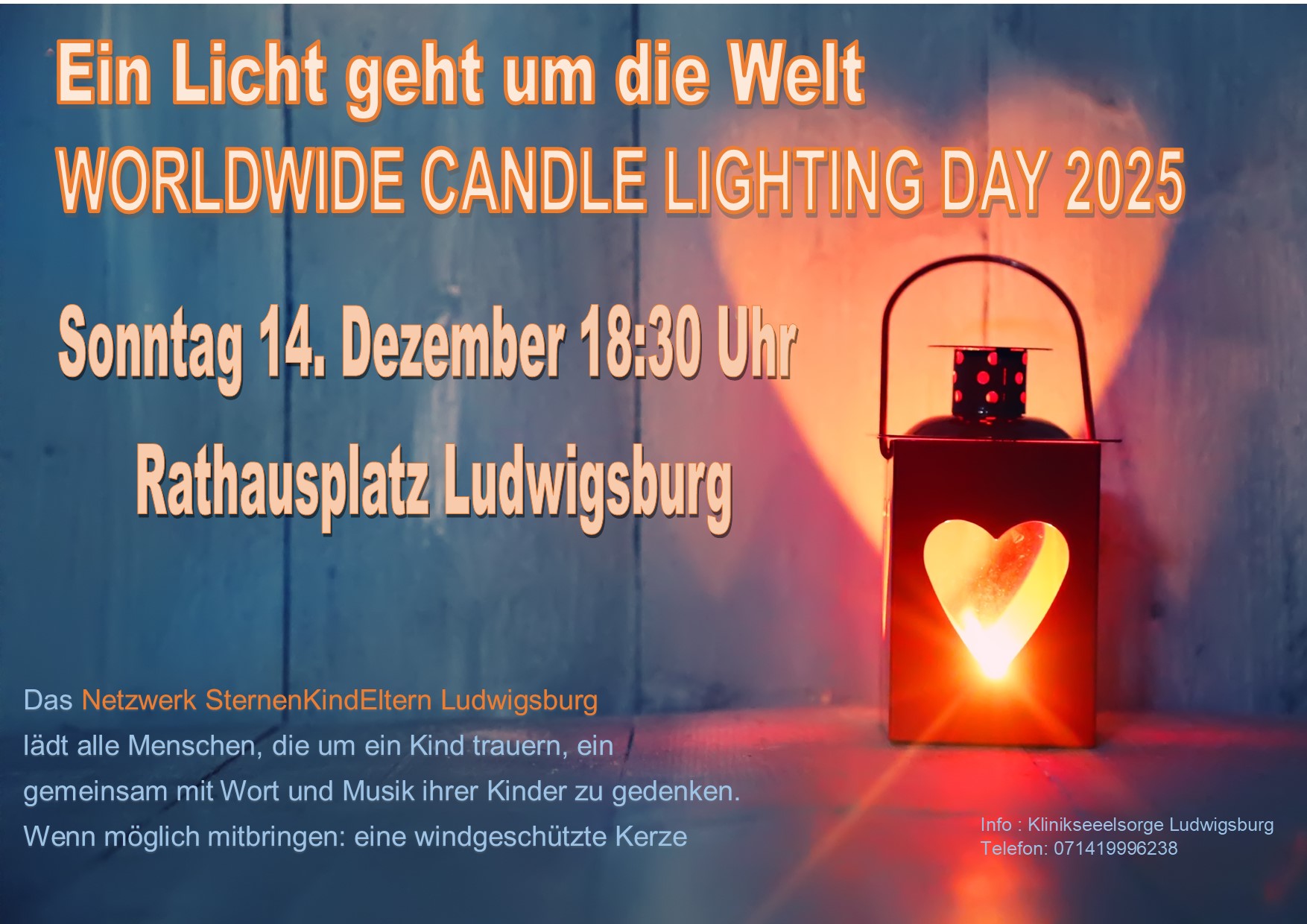 Rathausplatz Ludwigsburg Rathausplatz, Ludwigsburg14. Dezember | 18.30 Uhr Worldwide Candle Lighting Day Das Netzwerk SternenKindEltern Ludwigsburg lädt alle Menschen, die um ein Kind trauern, ein gemeinsam mit Word und Musik ihrer Kinder zu gedenken. Wenn möglich mitbringen: eine windgeschützte Kerze. 14. Dezember | 18:30 Uhr | Rathausplatz Ludwigsburg Info: Klinikseelsorge Ludwigsburg Telefon: 07141 9996238 Ritual-Vorschlag für trauernde Angehörige… Worldwide Candle Lighting Day